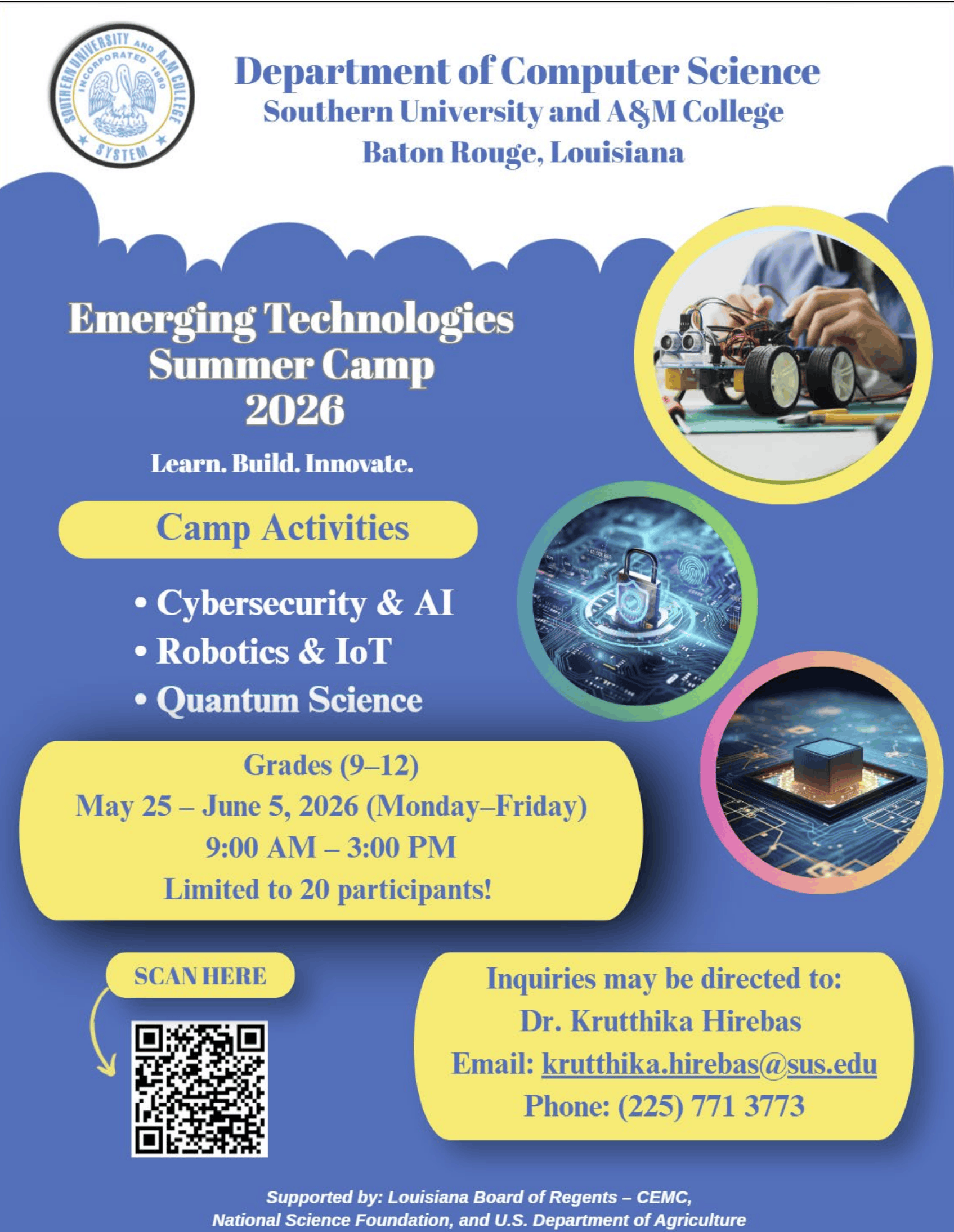 High school students (9-12) are eligible to apply for the camp. Students of all backgrounds and skill levels are welcome to join! There are a limited number of spots available, so please fill out this Registration Form and submit a letter of recommendation to request a seat in the Southern University Cybersecurity Youth Camp.