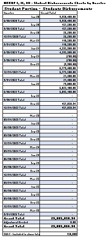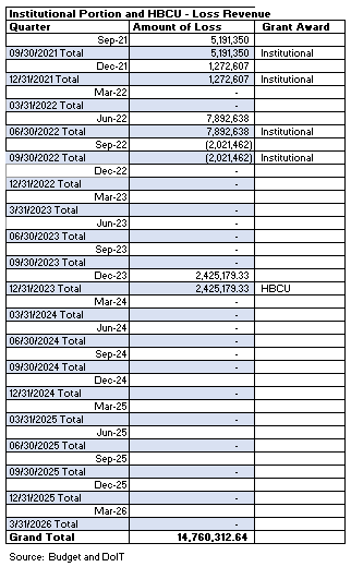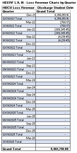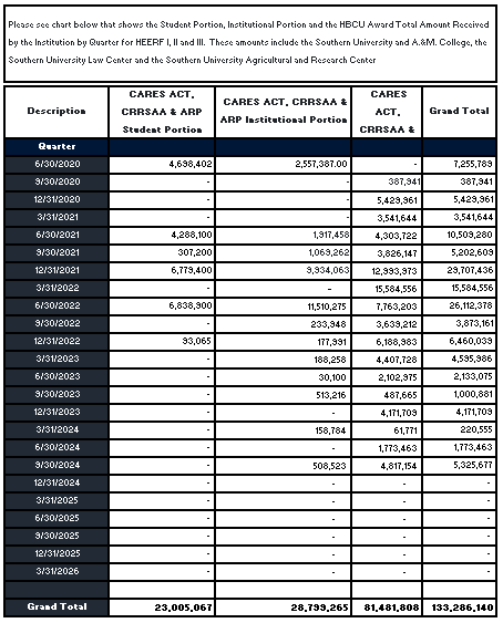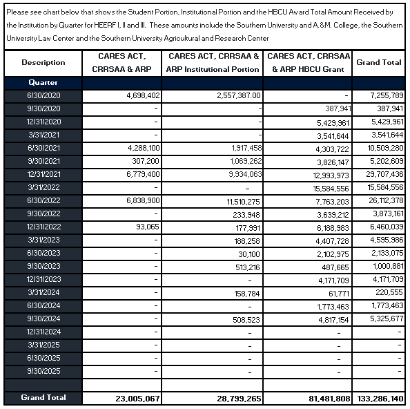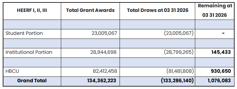 Student Portion - CFDA# 84.425E, Award Number P425E200926, Award Amount is $$23,005,067. Institutional Portion - CFDA# 84.425F, Award Number P425F201887, Award Amount $28,944,698. HBCU - Emergency Relief Fund CFDA# 84.425J, Award Number P425J200055, Award Amount 82,412,458. |