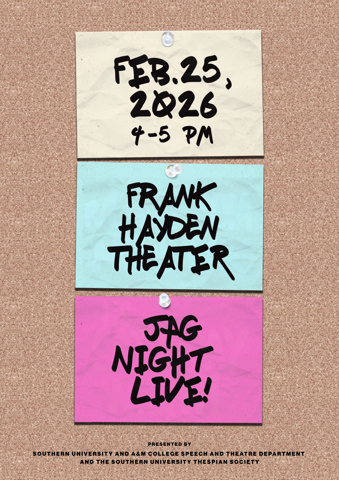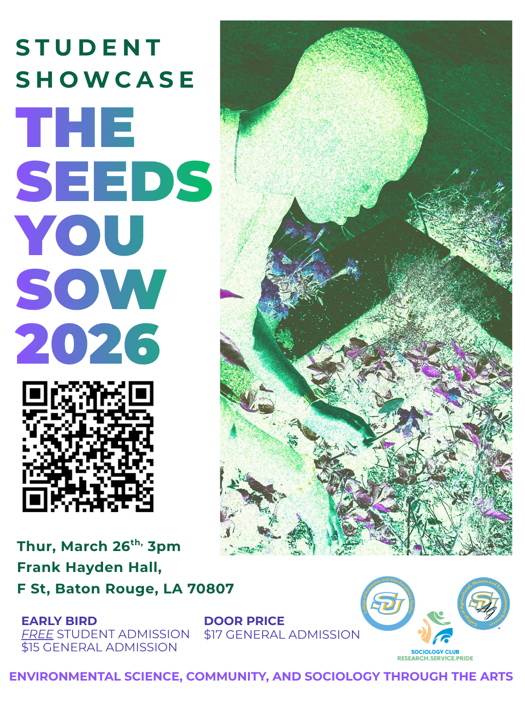 “The Seeds You Sow” is a student-led interdisciplinary showcase that blends agricultural science, environmental storytelling, performance art, and sociology. The event highlights the connections between land, culture, and community. Through mixed media the showcase transforms academic research and identity into an accessible artistic experience that invites audiences to learn, reflect, and engage. Led by Chasity Joseph, collaboratively produced by the Theater, Dance, Music, Art, and Agriculture programs.